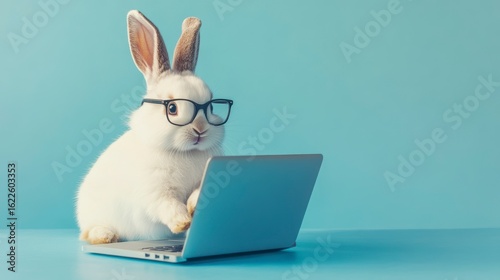 Cute white rabbit wearing glasses uses laptop computer.
