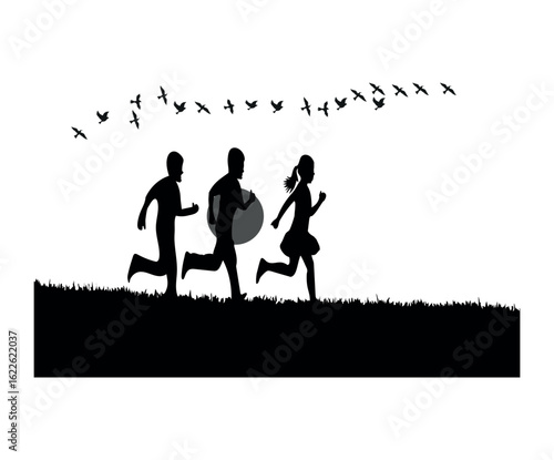 Silhouette of Children Running on Grass with Flying Birds in the Sky.