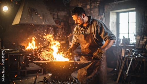 Craftsman shaping glowing metal amid flying sparks inside a rustic forge workshop