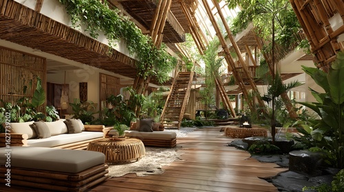 Indoor outdoor space of green hotel plant growing along wall open bamboo furniture natural airflow designed sustainable luxury travel tropical climates custom tropical resort background human eye view