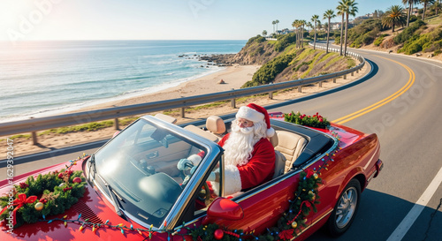 Santa claus driving red convertible car decorated with christmas garland on scenic coastal road. Holiday road trip in exotic paradise for new year travel and automotive marketing