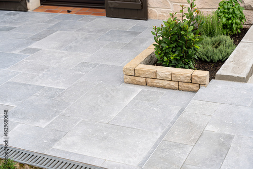 Terrasse extérieure avec carrelage imitation béton gris clair, design moderne et minimaliste