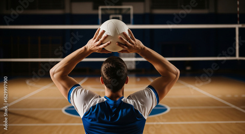 Back view of a volleyball player preparing to serve a white ball over the net on an indoor court, rady for the game