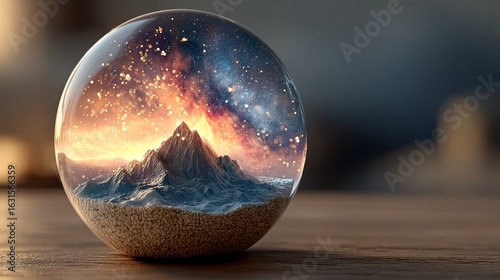 A mesmerizing miniature volcano glowing under ethereal blue clouds within a shimmering glass dome filled with golden particles