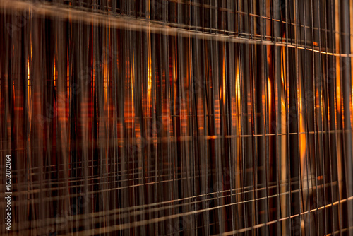 Zachodzące światło odbijające się w powierzchni oscynkowanej stali. Kraty , ogrodzenie do zabezpieczenia terenu. Tekstura ze stali i zachodzącego słońca, wygląda jak stal pochodząca do czerwoności.