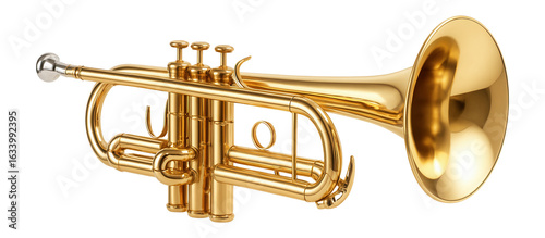 Shiny golden brass trumpet featuring detailed valves and mouthpiece on transparent background.