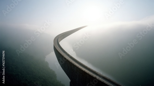 Curved concrete viaduct disappearing into mist over a tranquil lake and wooded hills