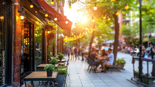 Atmospheric urban cafe scene with outdoor dining and warm bokeh lights at golden hour