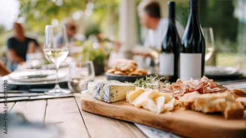 Outdoor wine and cheese tasting with artisan selection on wooden board. Elegant dining experience featuring gourmet bottles and fresh appetizers at restaurant terrace with people enjoying lunch.