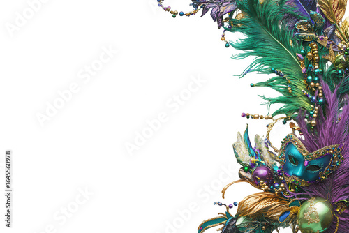Mardi gras mask and feathers with colorful beads and glitter, isolated on transparent background