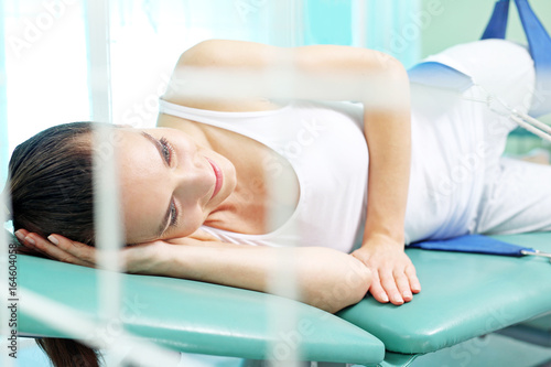 Ćwiczenia rehabilitacyjne po urazie nogi. Pacjent ćwiczy na podwieszkach w klinice rehabilitacyjnej.