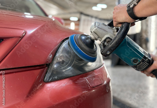 Car detailing series: The process of polishing the headlights. Hands of male professional worker with orbital polisher in auto repair shop, polishing car headlight. Car wax polishing process close up.