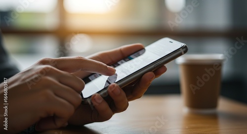 Persona revisando aplicación financiera en smartphone durante pausa de café en entorno relajado de trabajo remoto