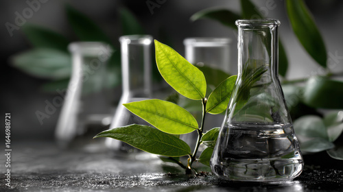 Green leaf with glass flask and water in laboratory setting showing natural science concept