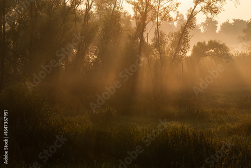 Piękny zamglony krajobraz, mgła nad wilgotną łąką, Polska, Śląsk.