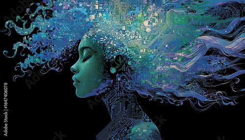 FUTURYSTYCZNA SYLWETKA KOBIETY Z FALUJĄCYMI, NIEBIESKIMI WŁOSAMI