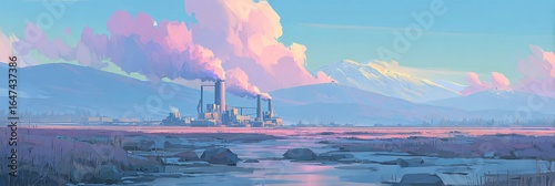 PASTELOWA ILUSTRACJA FABRYKI BIOMASY W STYLU FLAT DESIGN