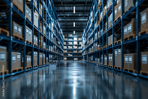 大型物流倉庫の棚と整然と並ぶ荷物の内部風景