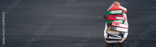 Businessman overworked carrying a pile of binders and folders