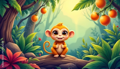 an animated monkey perched on a stone ledge amidst a lush jungle setting. the monkey has large, expressive eyes and appears cheerful, looking directly at the viewer