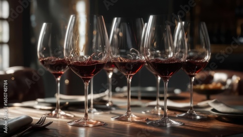 Elegant Wine Glasses with Splashing Red Wine, Fine Dining, Dark Mood.