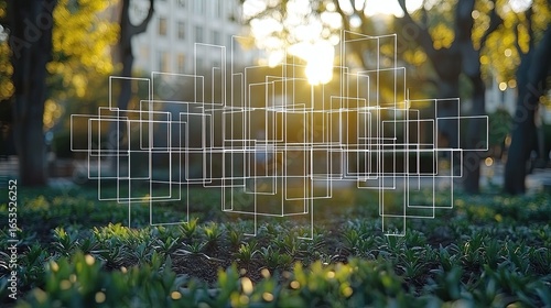 Abstract geometric shapes overlaying a park scene with sunlight and greenery evoking digital