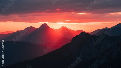 Sunset Over Mountain Ridges with Vibrant Orange and Red Skies