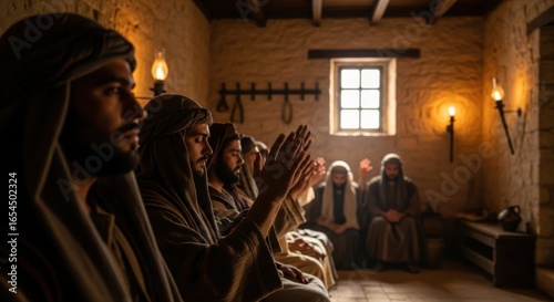 Men in biblical robes praying with raised hands in a humble room, an ancient setting for spiritual devotion and worship.