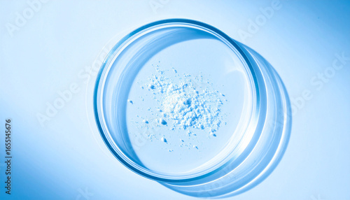 Powder sample in glass petri dish. Science and microbiology. Laboratory experiments.