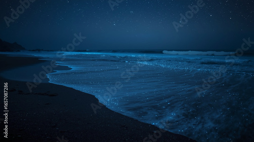 Dramatic Bioluminescent Waves Crashing on a Dark Sandy Beach at Night