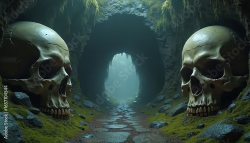 Giant skull guardians frame cave entrance on mossy path. Misty tunnel leads into mysterious darkness, with stalactites, rocks. Spooky scene for horror, adventure, fantasy themes. Perfect for movie