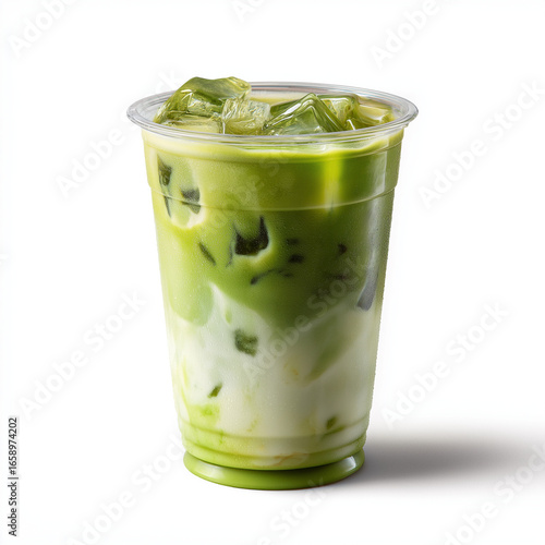 Mrożona matcha latte w plastikowym kubku z lodem na białym tle