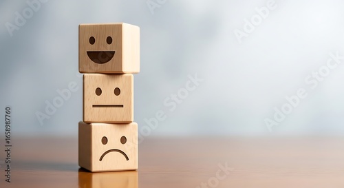 Wooden blocks with happy, neutral, and sad faces for customer feedback concept