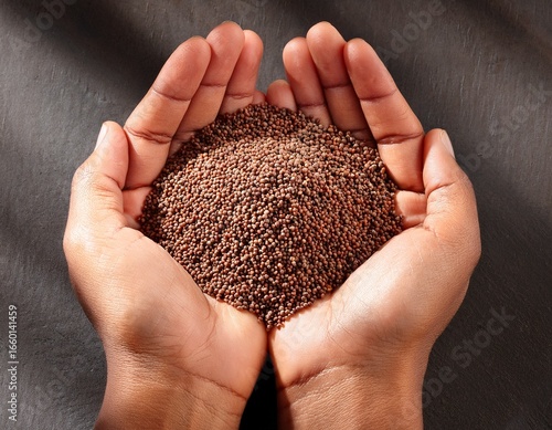 hands with handful of brow mustard seeds