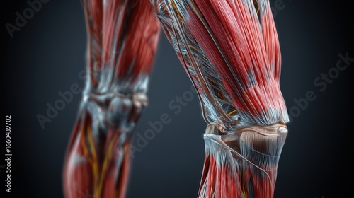 National Rehabilitation Awareness Week. 3D anatomical render of muscles and tendons in the leg during rehabilitation exercises, ultra-realistic medical visualization