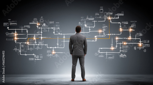 Businessman suit stands front of complex flowchart, symbolizing strategic planning and decision making. illuminated pathways represent various options and outcomes, evoking sense of innovation