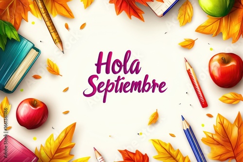 Un poster ilustrado que presenta material escolar como lápices, libros, manzanas y hojas de otoño temprano, con el texto dibujado a mano Hola Septiembre.