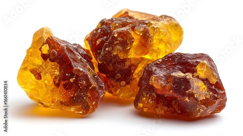 Three Pieces of Gum Rosin Stacked on a White Background, Featuring Golden Tones