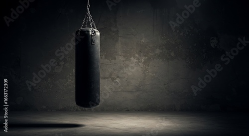 Punching Bag Hanging in Dark Gym Interior with Concrete Wall