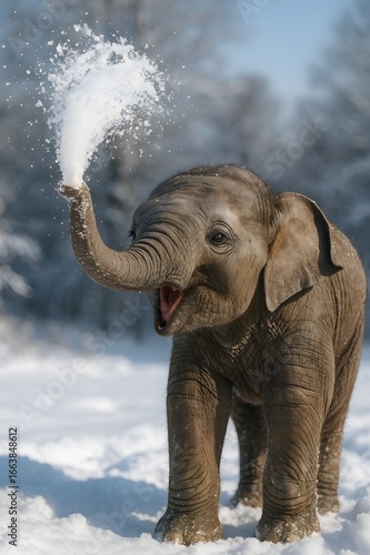 Funny Baby Elephant Spraying Snow Playfully with Trunk