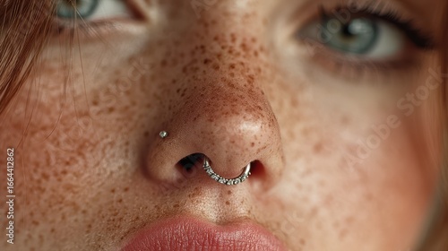 Close-up of a young person with freckles and unique nose piercings in natural light highlighting their facial features