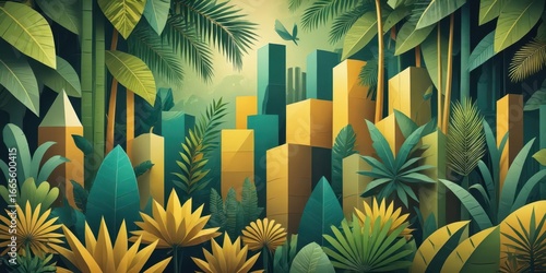 Jungle in Cubist Style with Dark Green and Yellow Shades