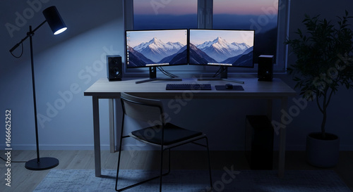 Night scene of a minimalist home office workspace with dual monitors displaying mountain landscape, wooden desk, chair, and floor lamp, showcasing productivity and serenity