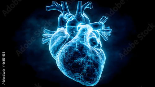 An anatomically detailed blue glowing digital rende of a human heart is isolated against a dark background, illustrating the vital organ for medical purposes.