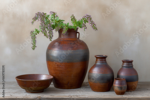 handcrafted clay pottery elegantly displayed on rustic wooden surface creating perfect ambiance