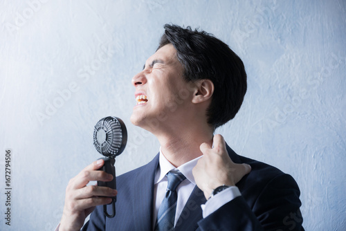 夏の暑さが大変な日本のビジネスマン 携帯扇風機を使うスーツの男性