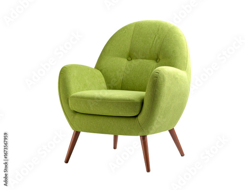 Zielony fotel o zaokrąglonych kształtach z drewnianymi nogami na przezroczystym tle