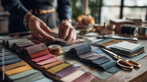 Praca z materiałami – projektant testuje tkaniny i faktury przed stworzeniem nowej kolekcji.