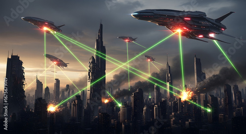 Futuristic metropolis under intense aerial assault by attacking spaceships firing destructive energy beams