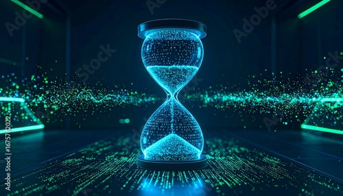 Digital Hourglass: A stunning visual representation of time's passage, with a luminous digital hourglass set against a futuristic background, evoking themes of time management and deadlines.